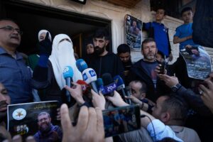 رندة ، زوجة خضر عدنان، الذي استشهد في سجن إسرائيلي بعد إضراب عن الطعام دام قرابة ثلاثة أشهر ، تتحدث لوسائل الإعلام في قرية عرابة بالضفة الغربية ، بالقرب من جنين ، الثلاثاء 2 مايو 2023. (الصورة: AP)
