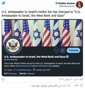 وتمكن عدد من الناشطين من التقاط صور “سكرينشوت” للتعريف الجديد على الحساب: “السفير الأمريكي لدى إسرائيل، والضفة الغربية وغزة”.